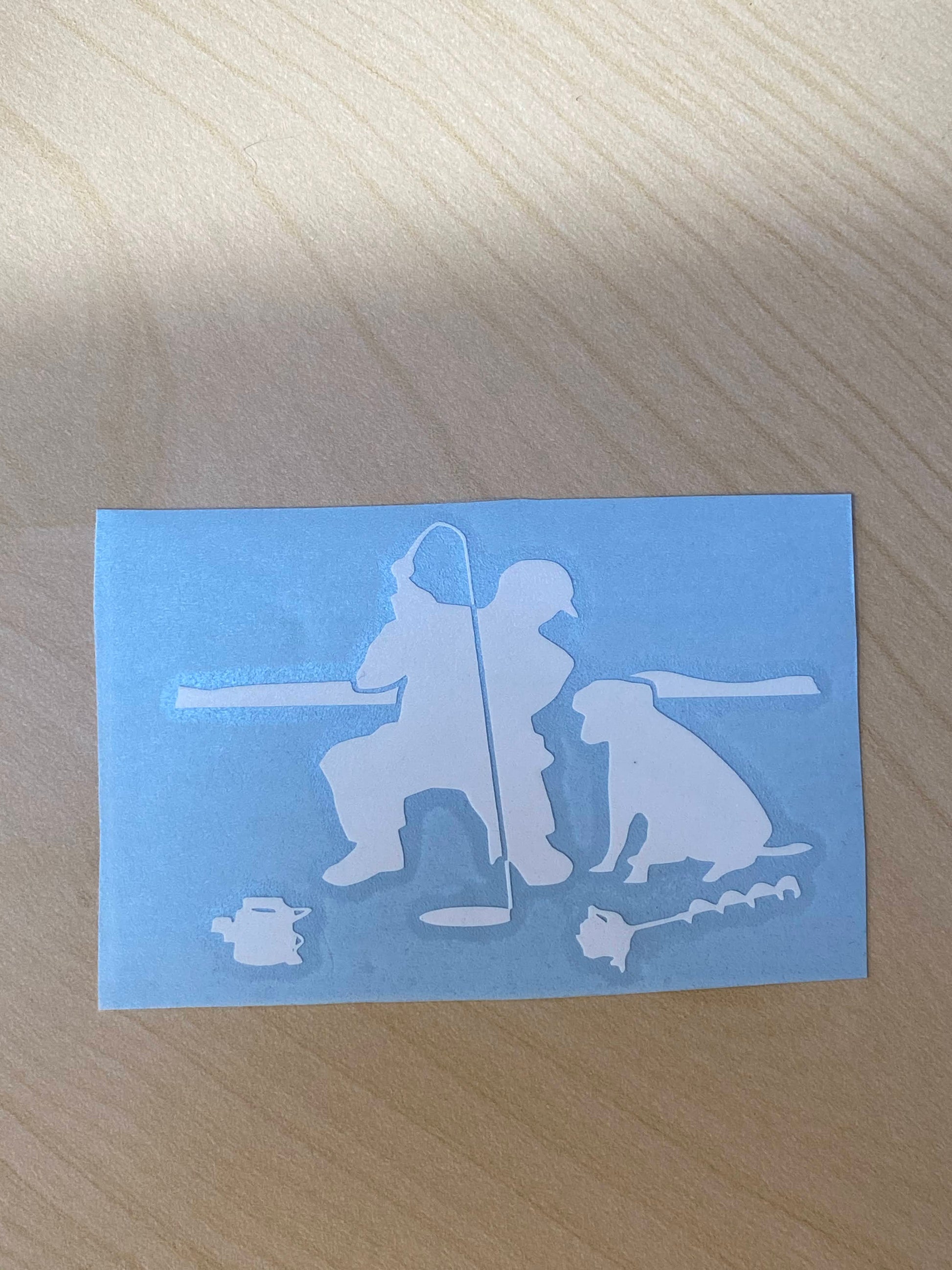 Sometimes the best fishing buddy is your dog. This decal symbolizes the scene of a good day on the ice.