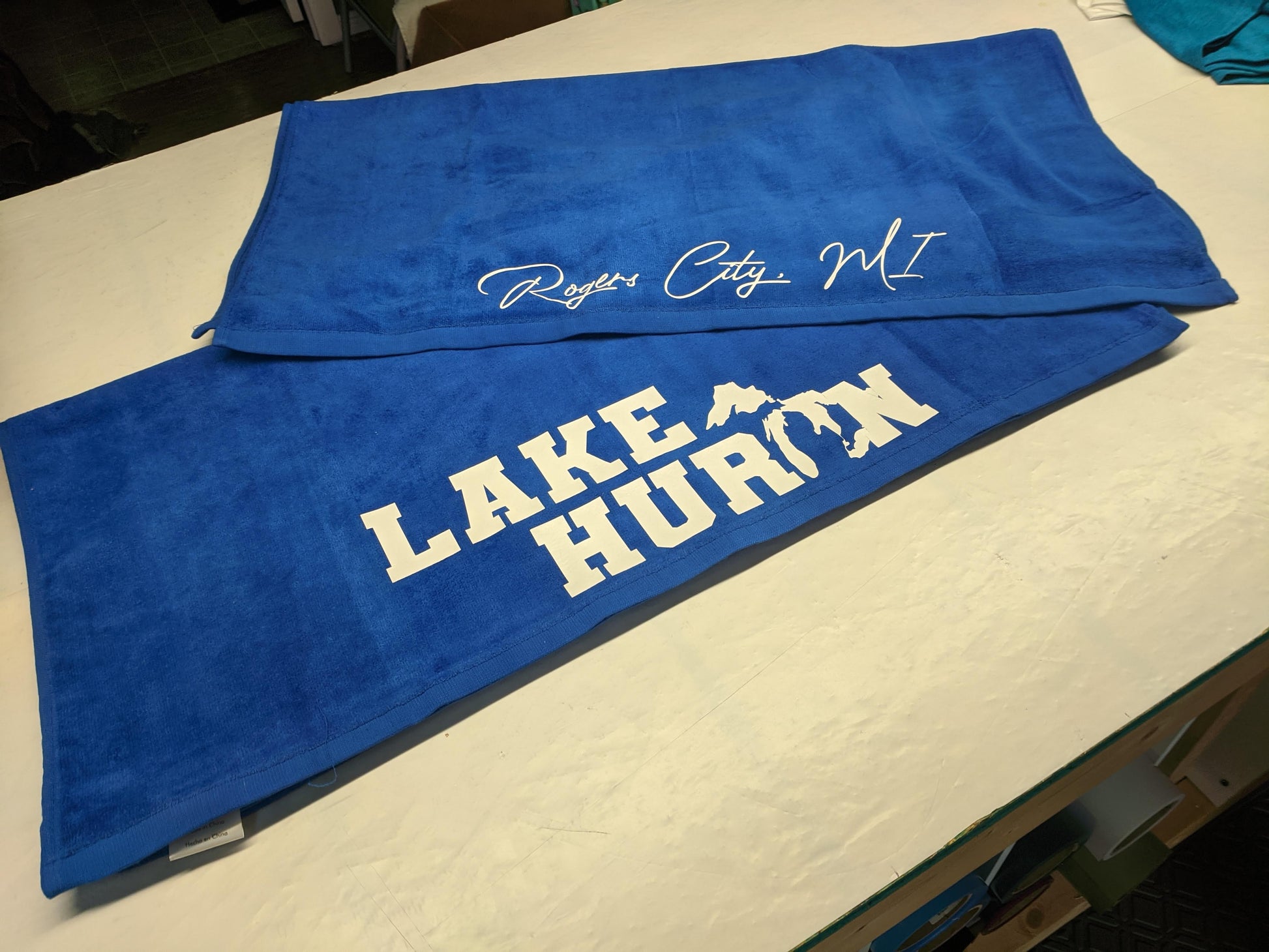 Royal Blue cotton blend beach towel with our Lake Huron design on one end and Rogers City Michigan signature on the other.
