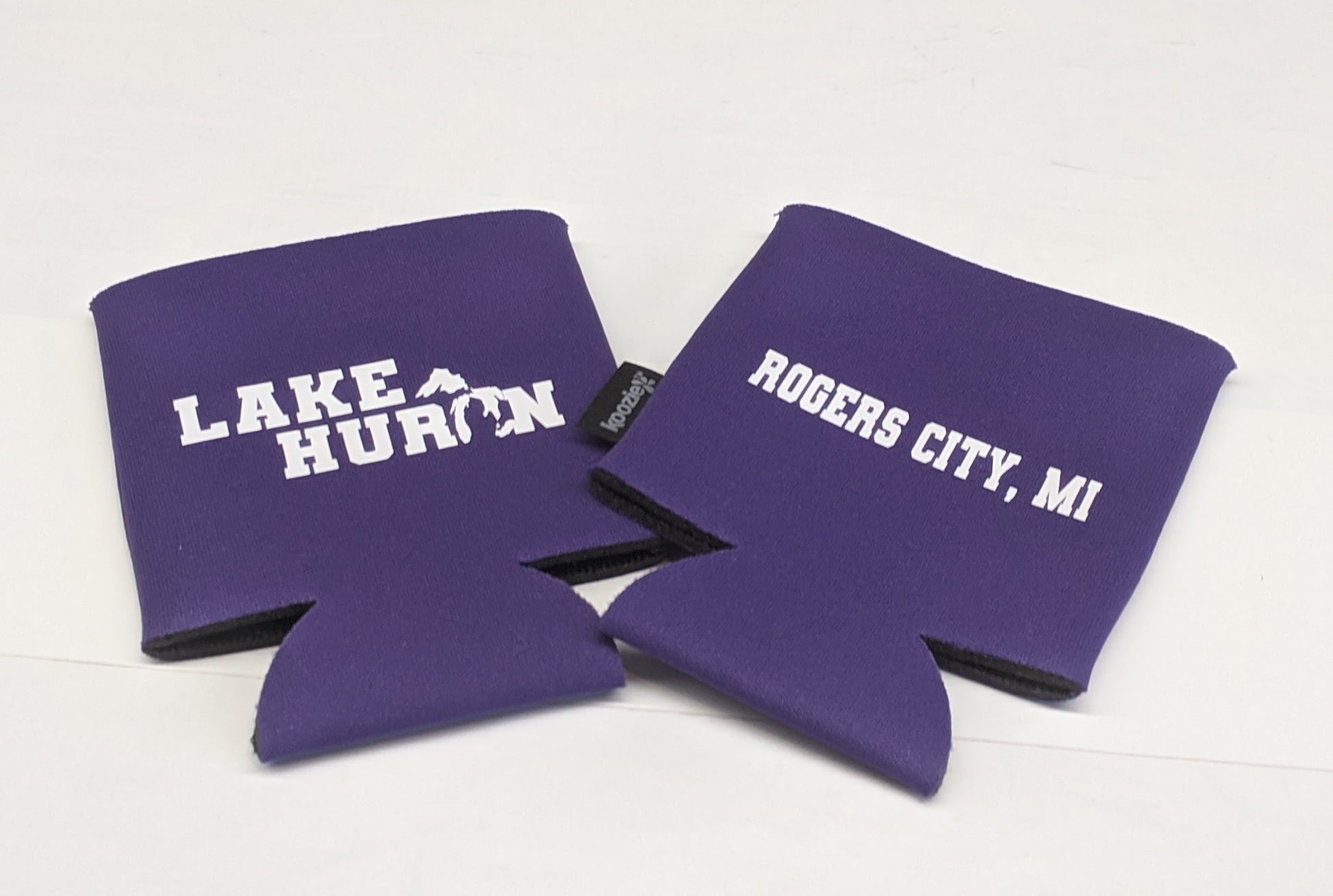 Keep your beverage cold with this purple can koozie with white vinyl designs.