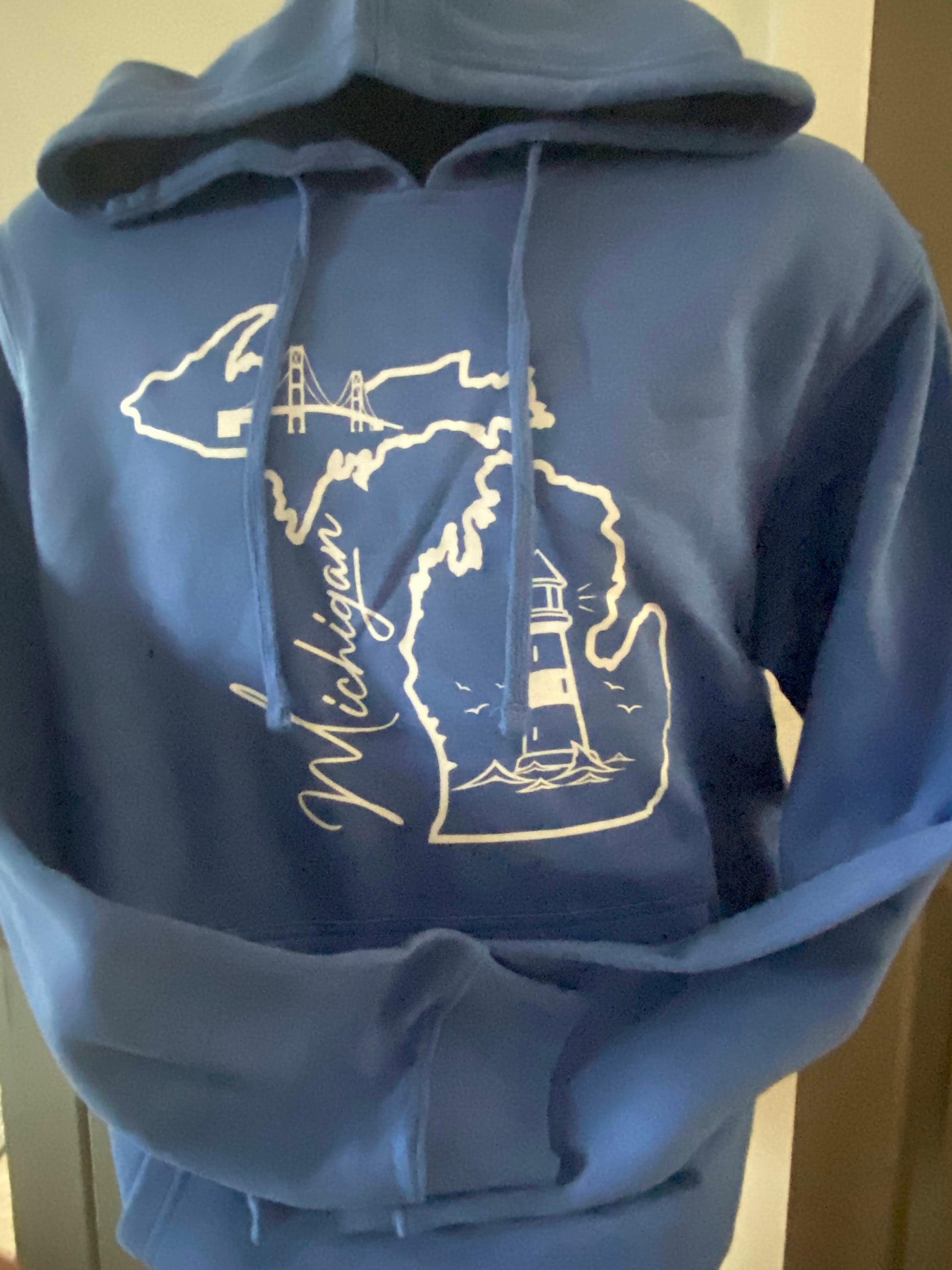 Royal Frost Blue hoodie featuring our Michigan Bridge Lighthouse design in white vinyl.