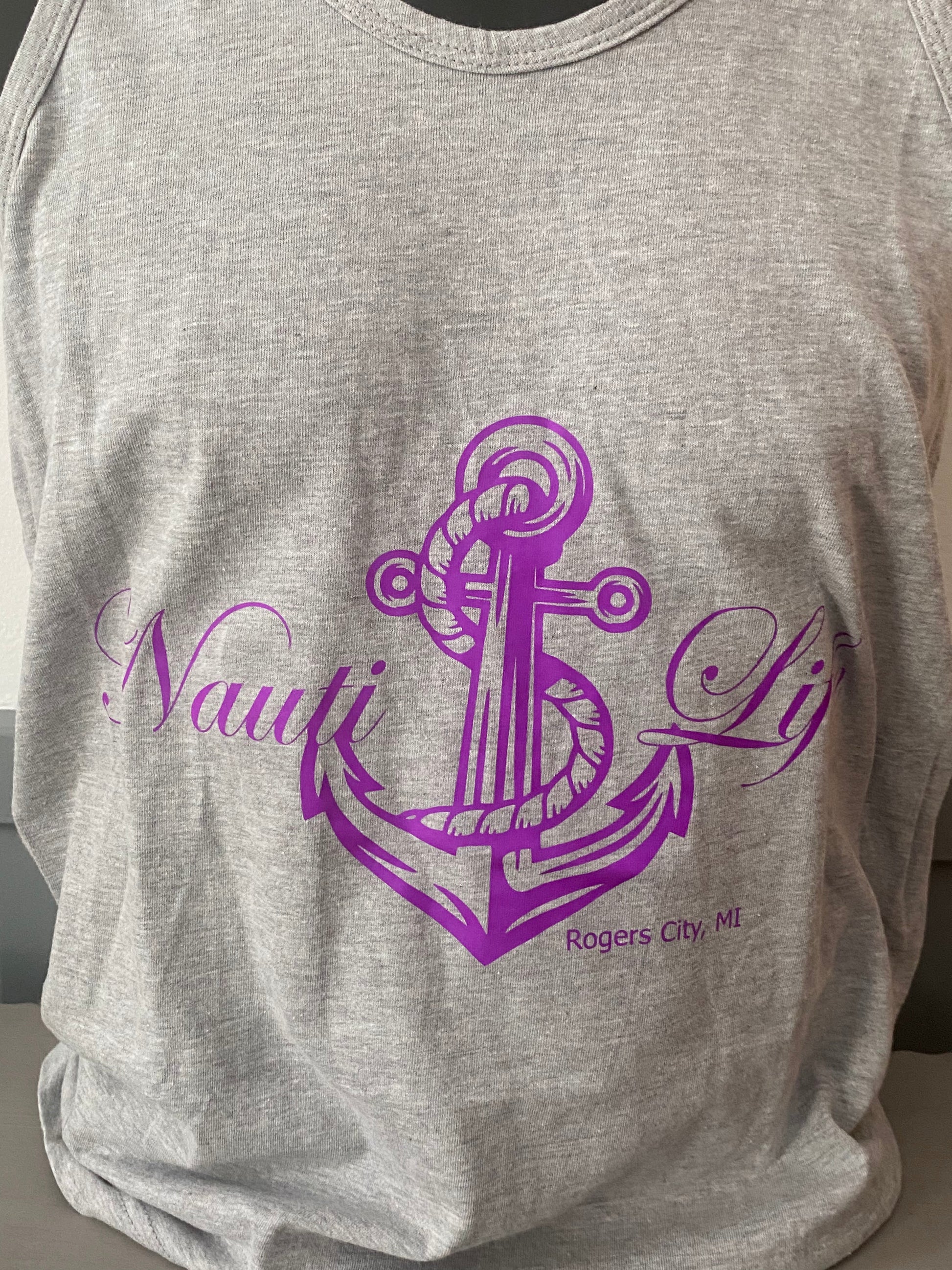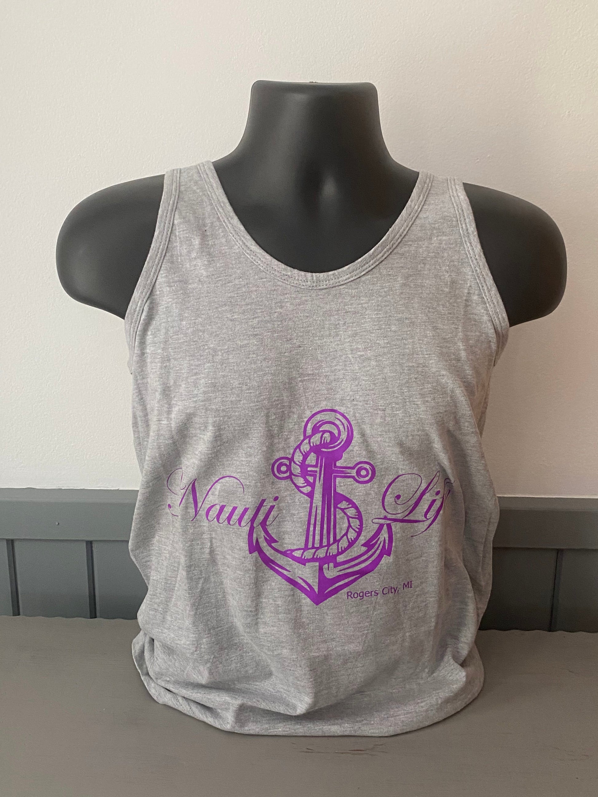 American Apparel Brand unisex cotton blend Grey tank top. Featuring our Nauti Life design in a bright purple vinyl.