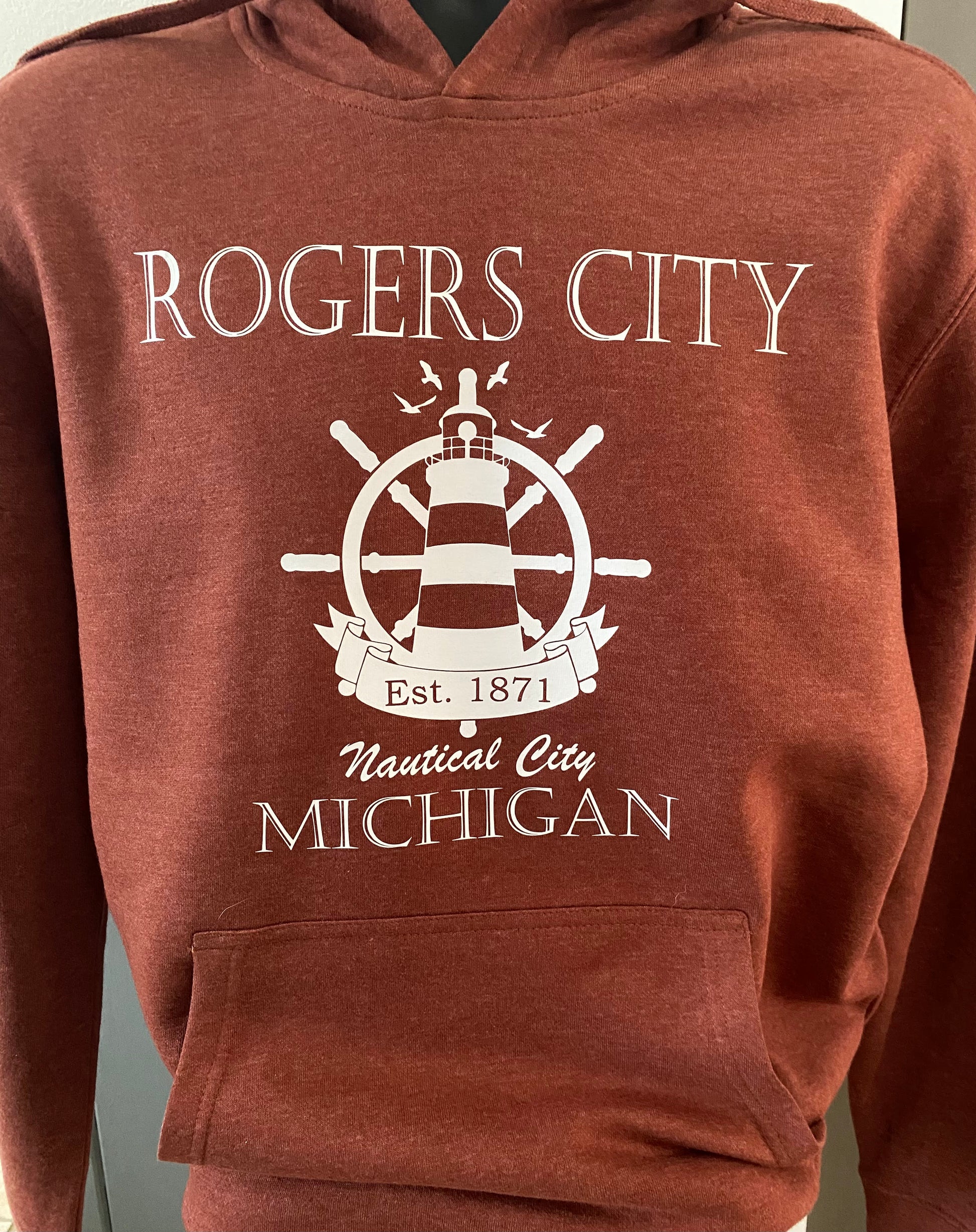 Russet colored hoodie featuring our Nautical City Lighthouse design in white vinyl.