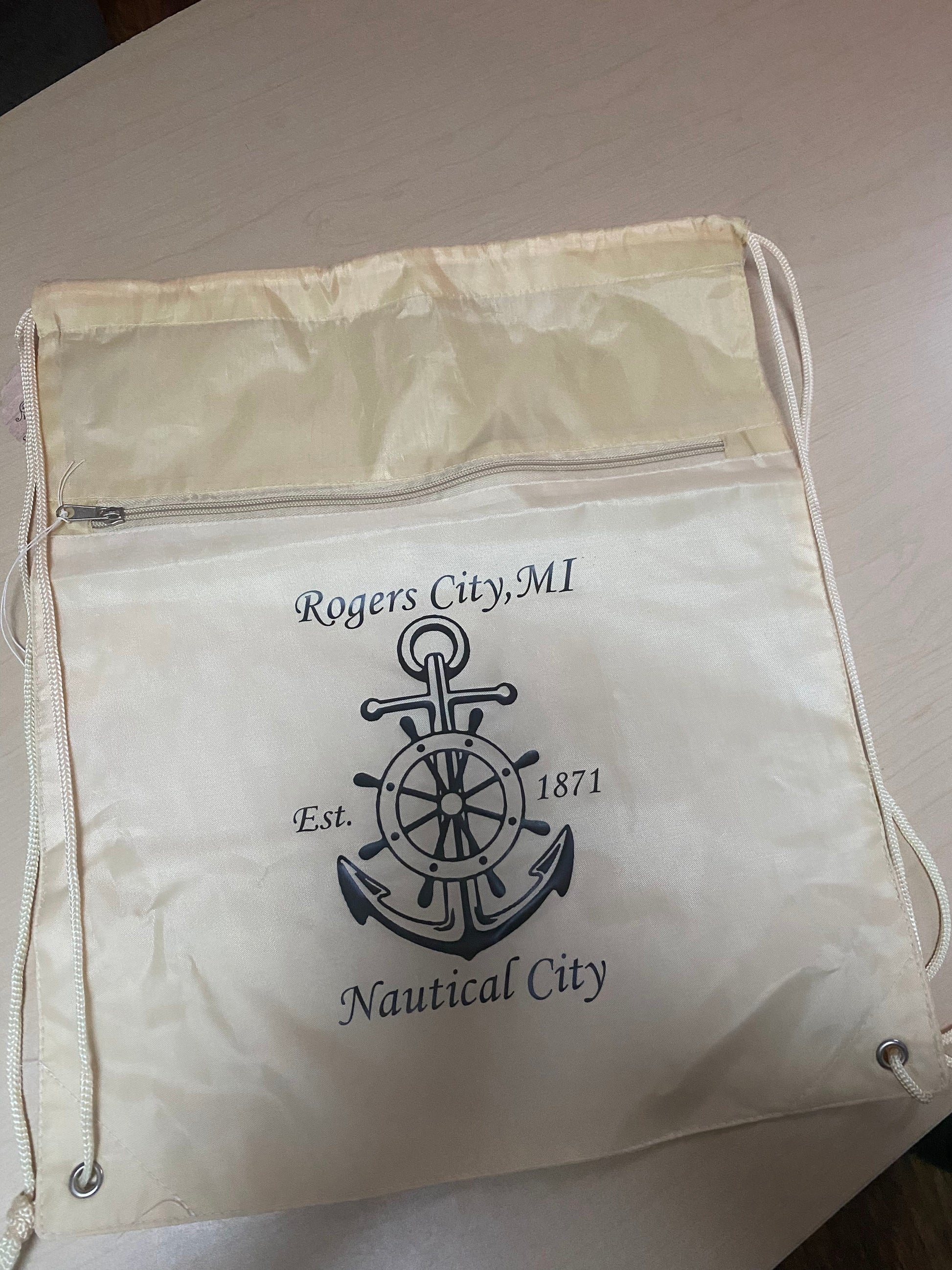 Tan 100% nylon drawstring bag featuring our Rogers City Anchor design in black vinyl.