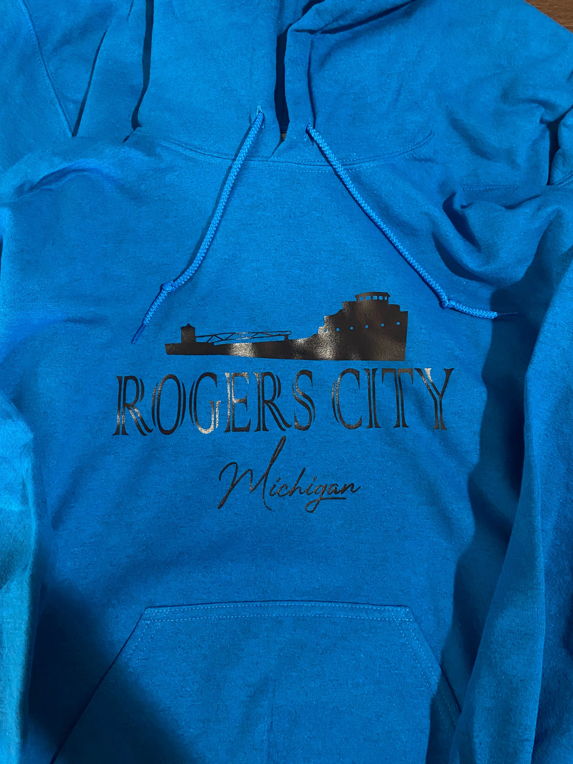 Blue Hoodie featuring our Rogers City Freighter design in black vinyl.