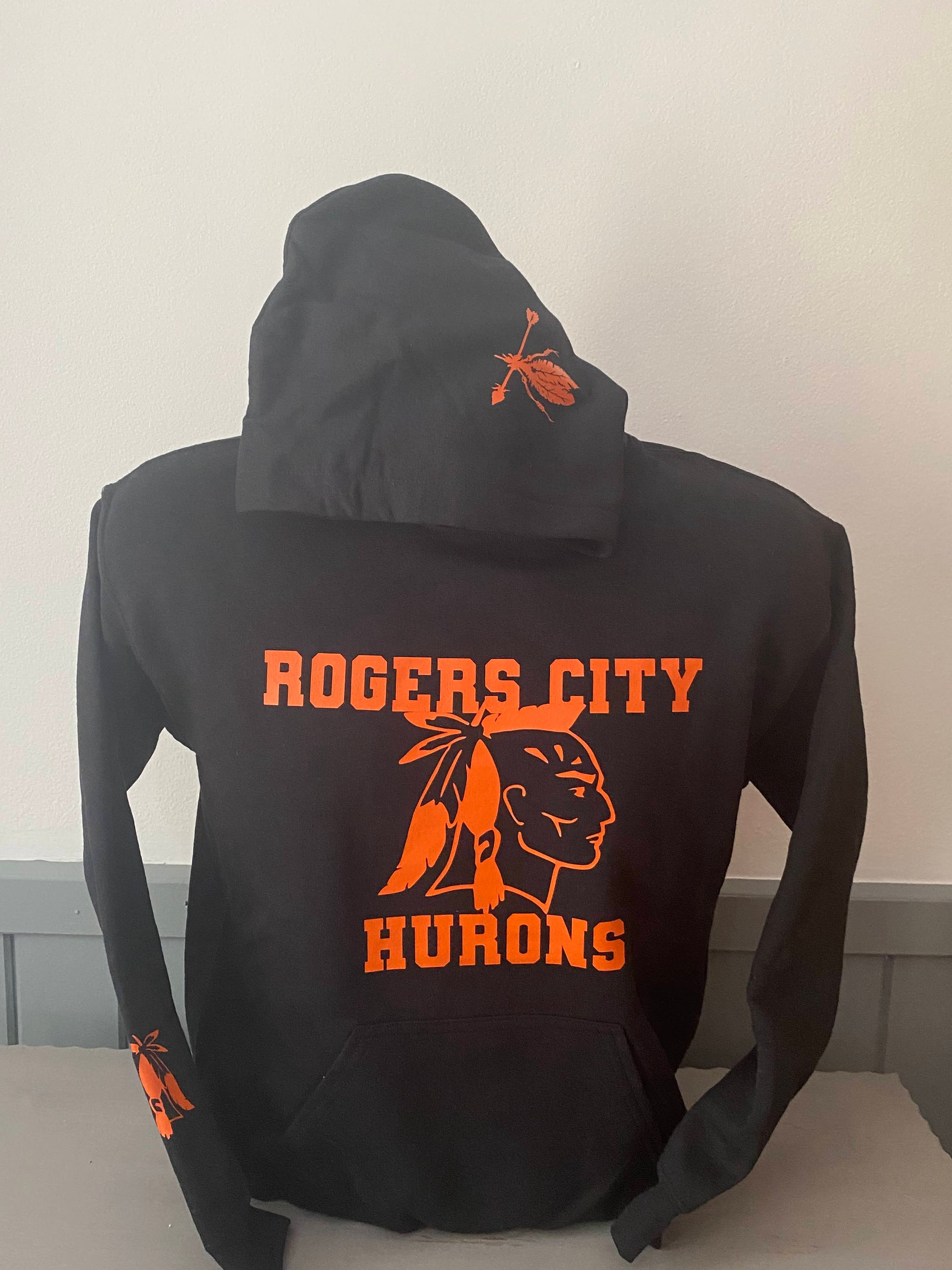 Black cotton blend hoodie featuring our popular Rogers City Hurons design in orange vinyl.