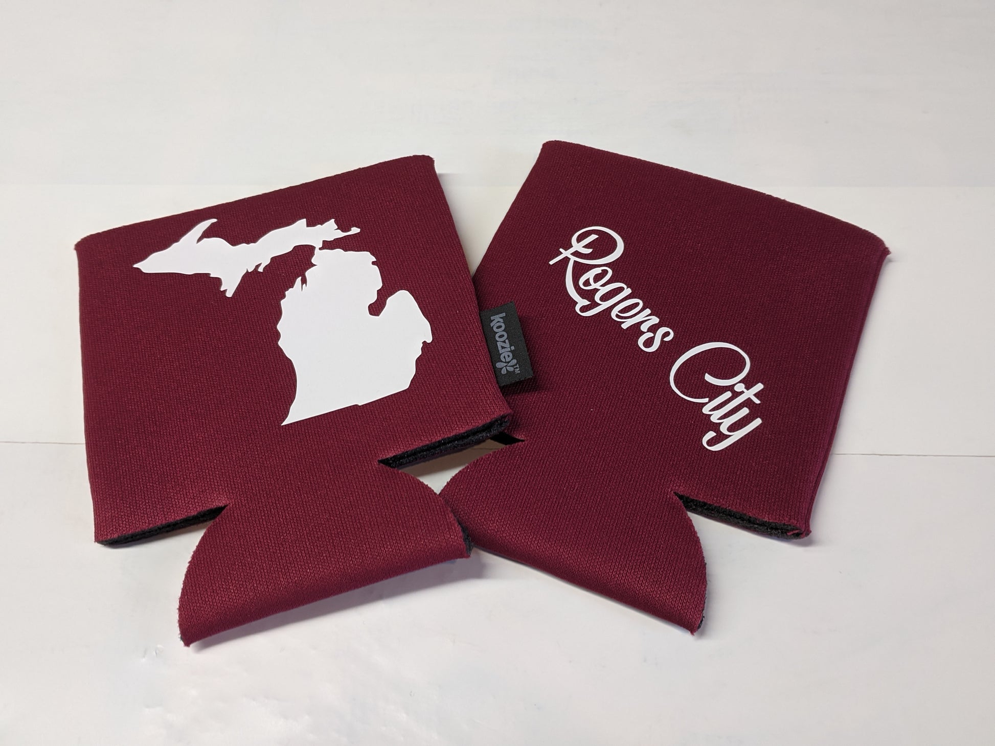 Keep your beverage cold with this Maroon can koozie with white vinyl designs.