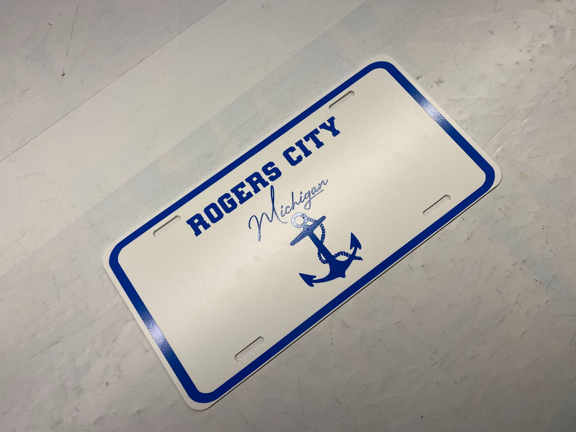 Durable white plastic license plate with our popular Rogers City Michigan design in a vibrant blue vinyl.
