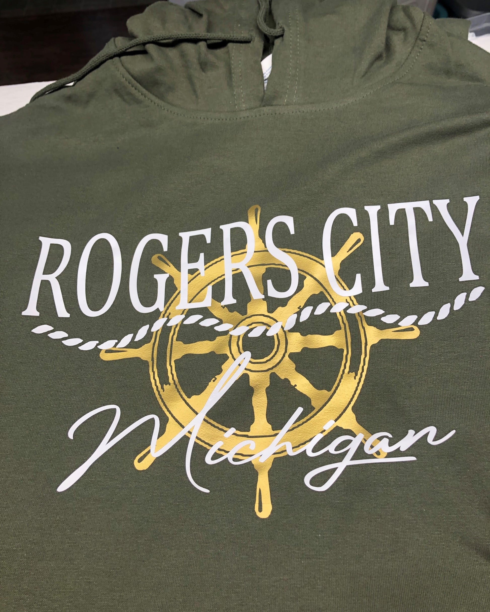 Moss Green Hoodie with gold ship wheel and white lettering vinyl design.