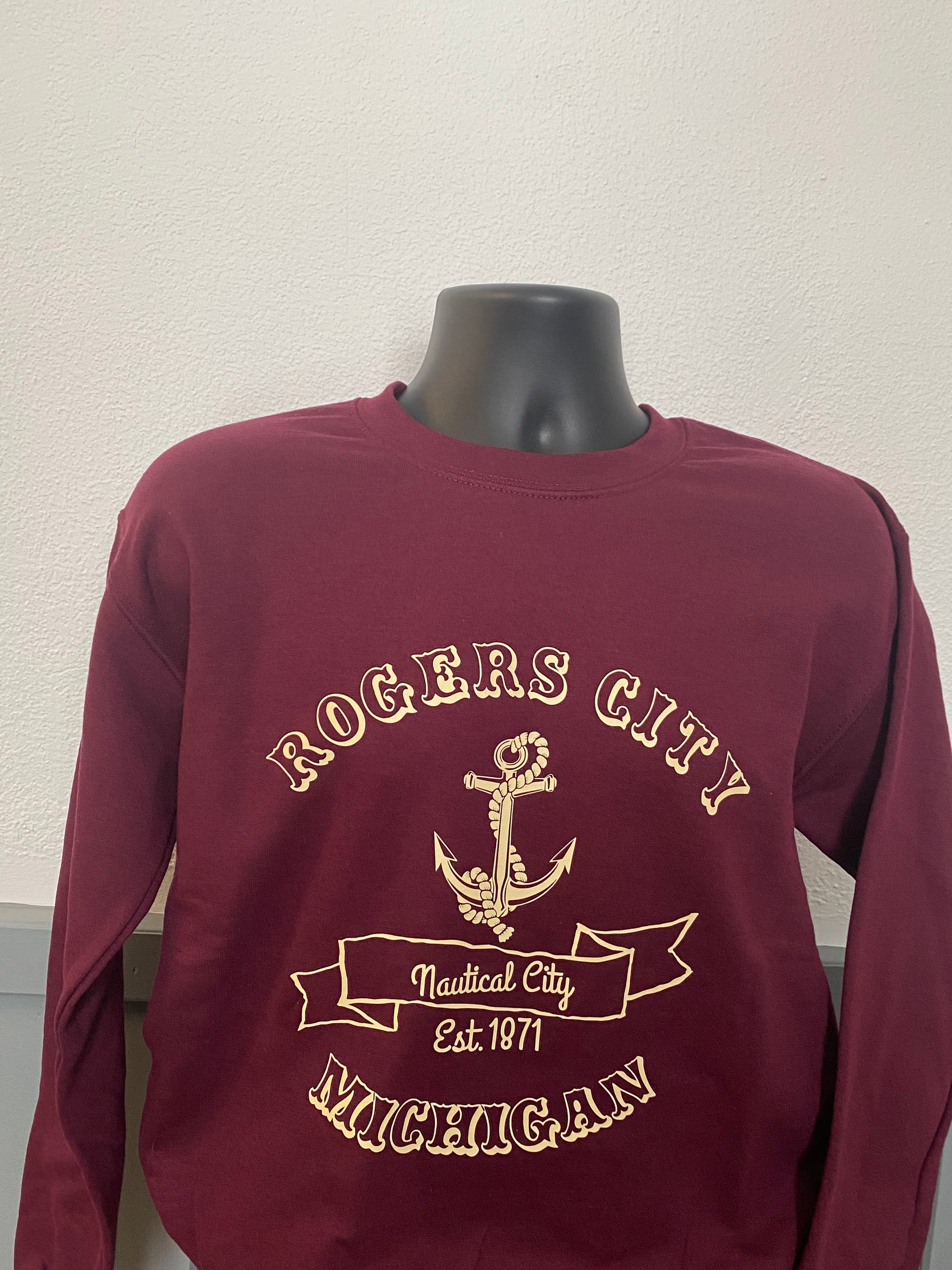 Maroon cotton blend crewneck sweatshirt with our popular Rogers City Nautical design in cream vinyl.