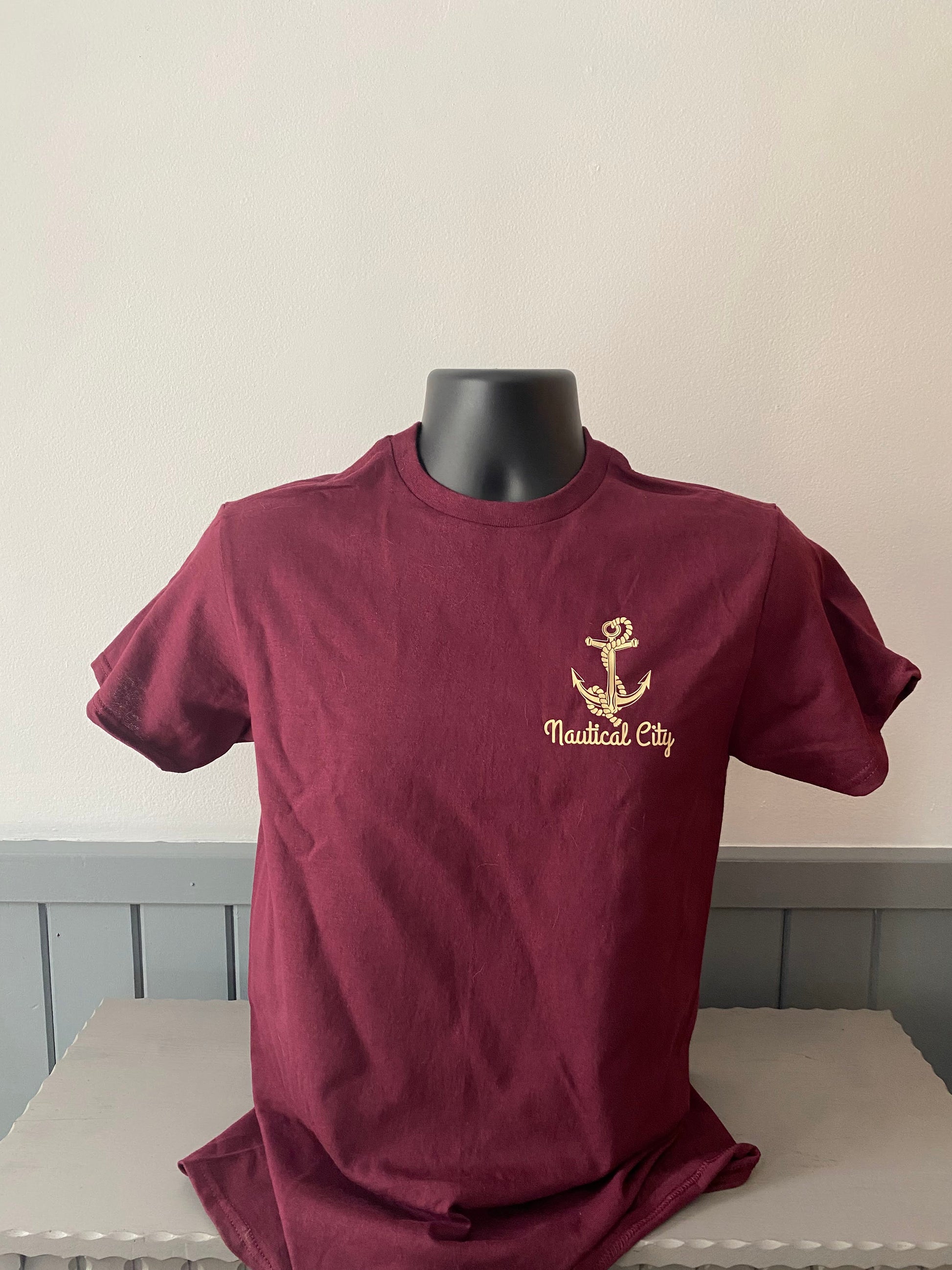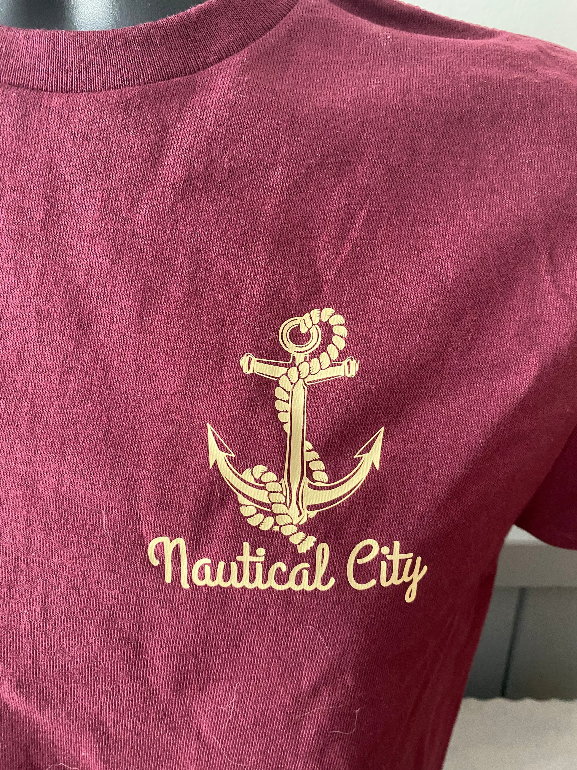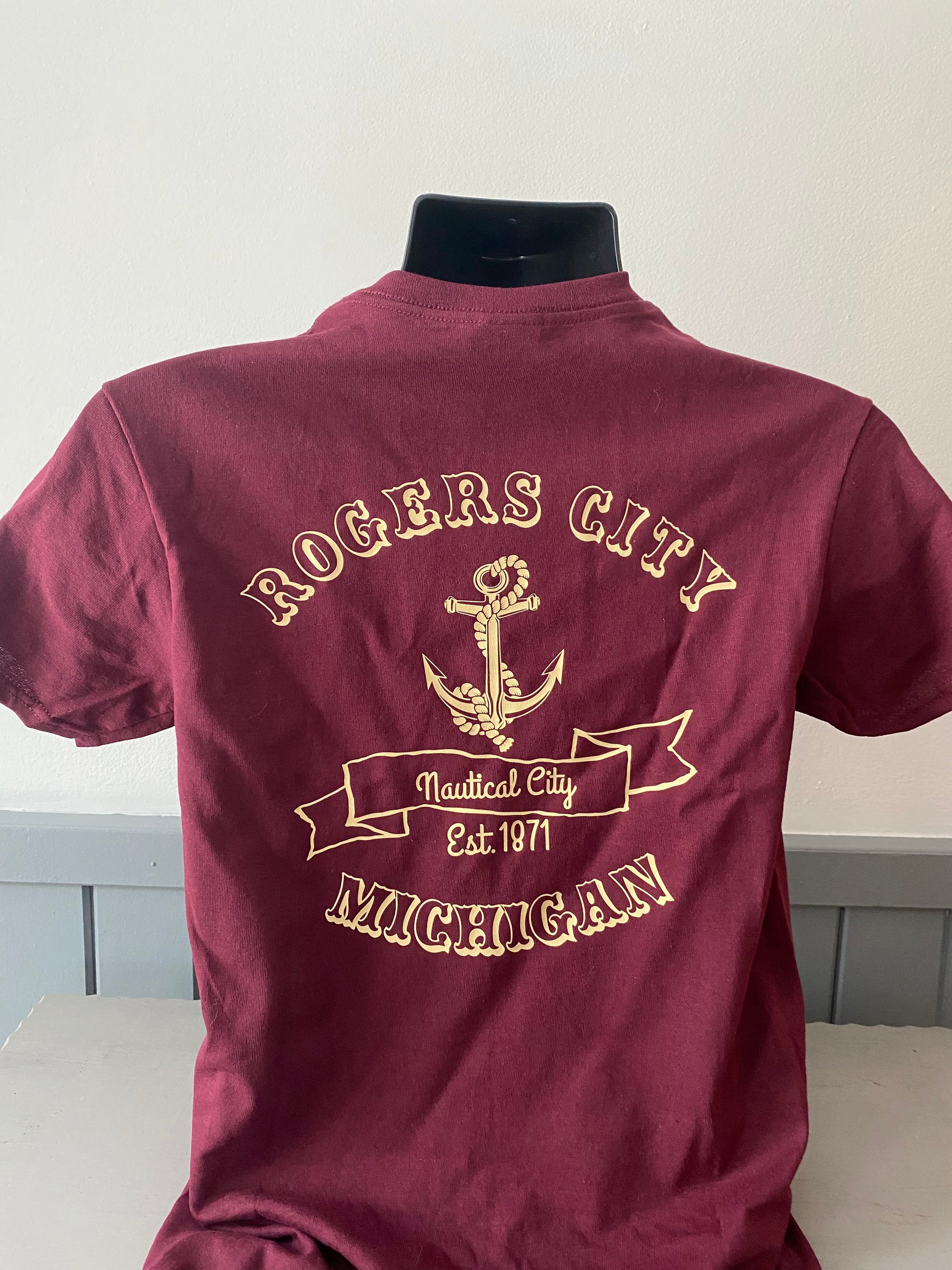 Maroon cotton blend t-shirt featuring our popular Rogers City Nautical design in cream vinyl. Also features "Nautical City" anchor pocket design on front.