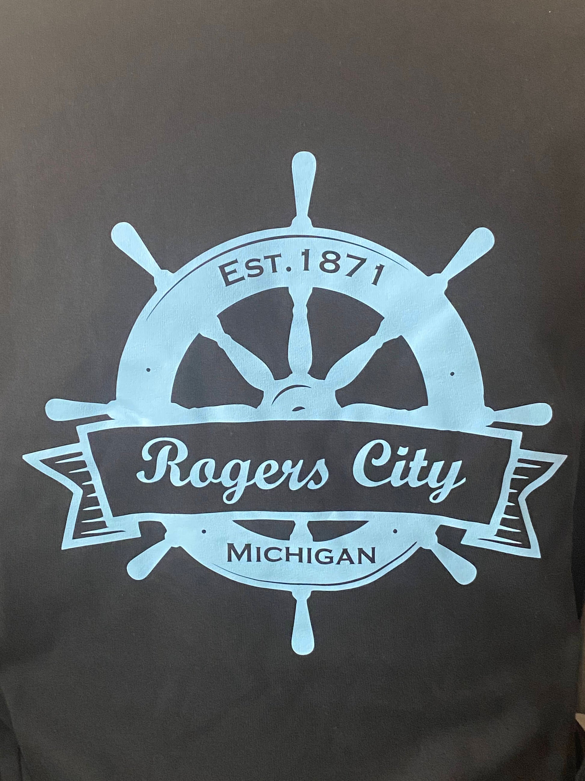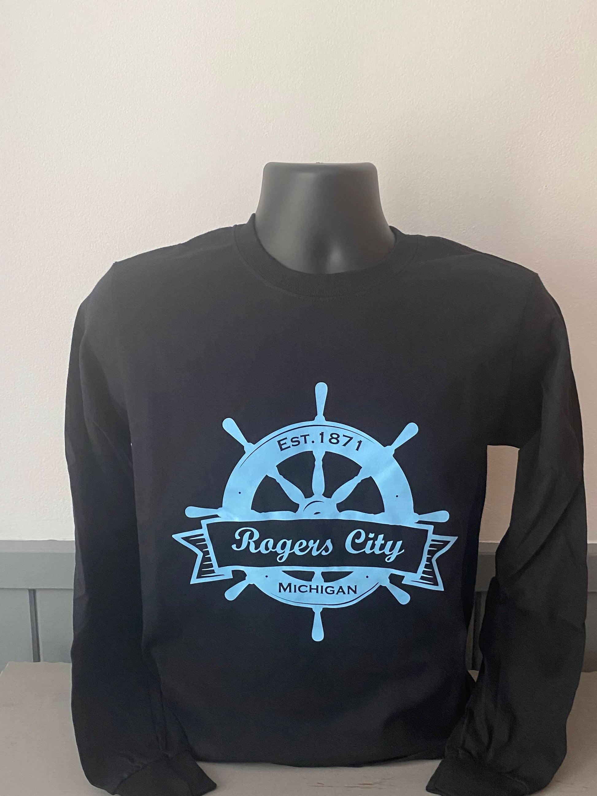 Black cotton blend long sleeve t-shirt featuring our Rogers City Ships Wheel design in light blue vinyl.