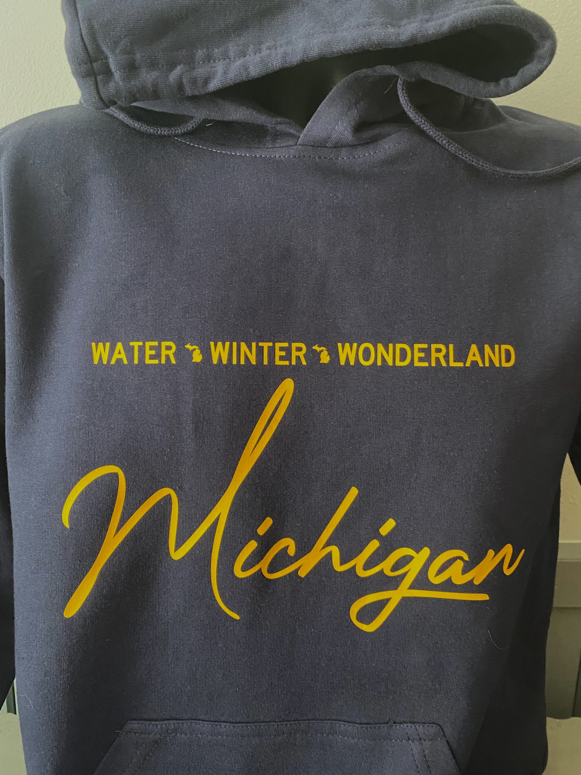 Navy cotton blend hoodie featuring our popular Water Winter Wonderland Michigan design in yellow vinyl.