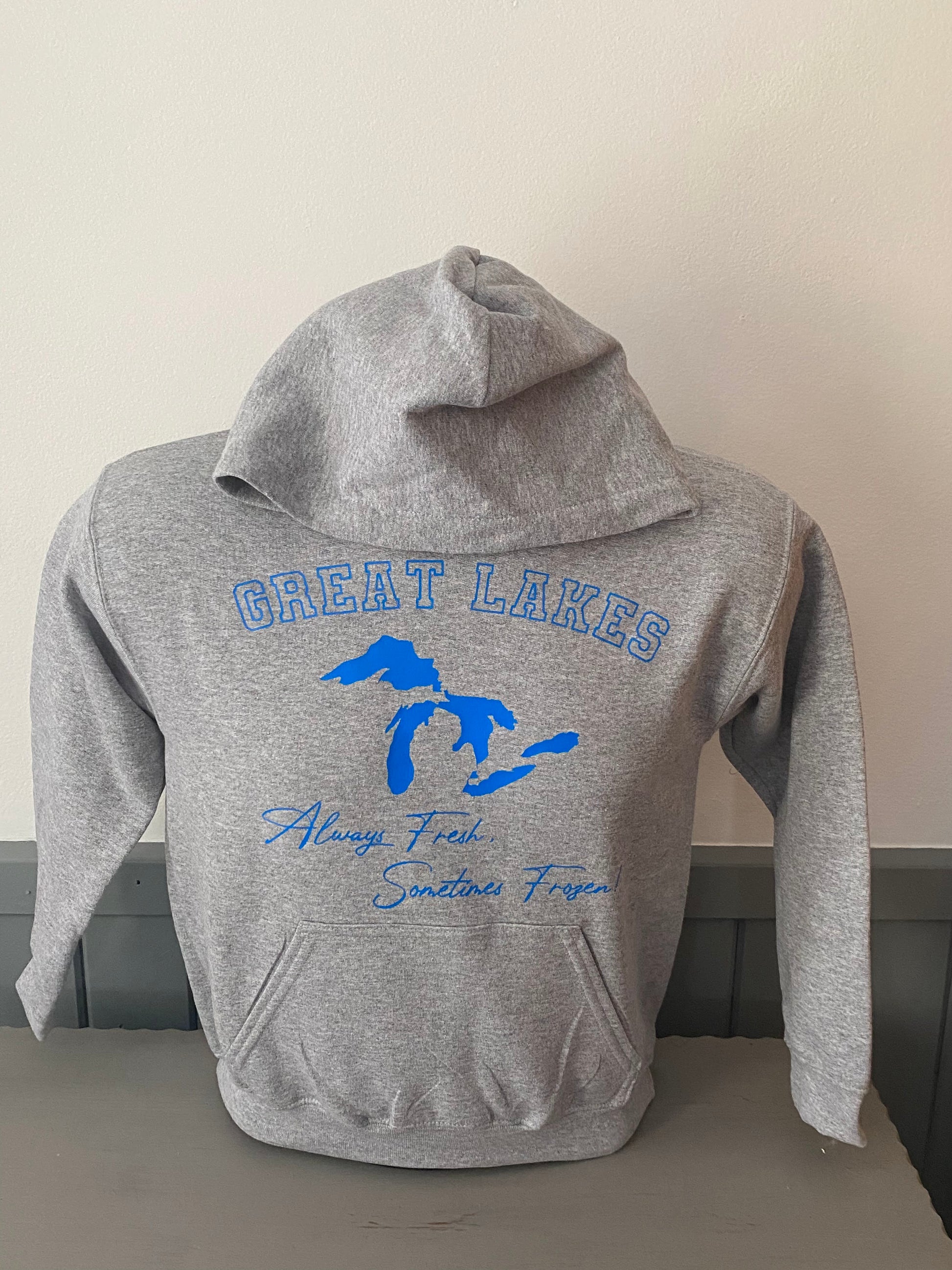Gildan Brand Grey cotton blend hoodie featuring our popular Always Fresh design in bright blue vinyl.