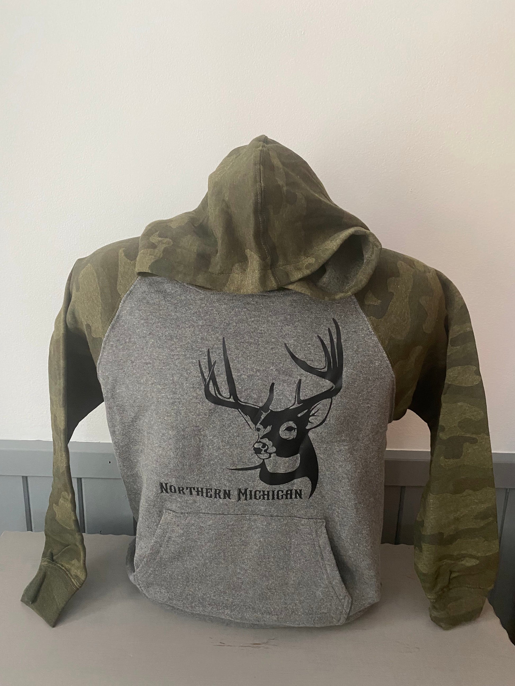 Independent Brand Camo/Grey cotton blend hoodie featuring our Northern Michigan Buck design in black vinyl.
