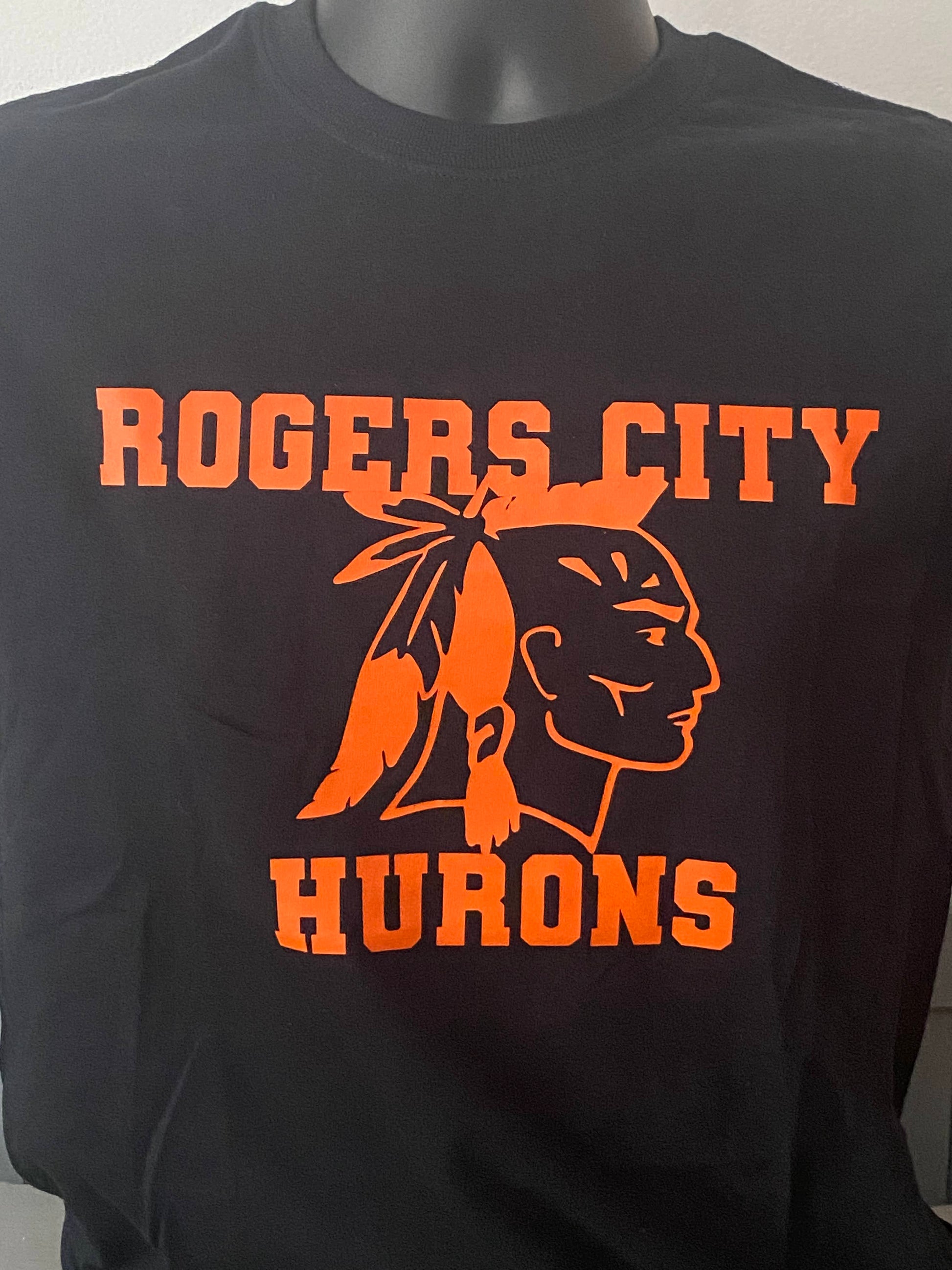 Black cotton blend t-shirt featuring our popular Rogers City Hurons design in orange vinyl.