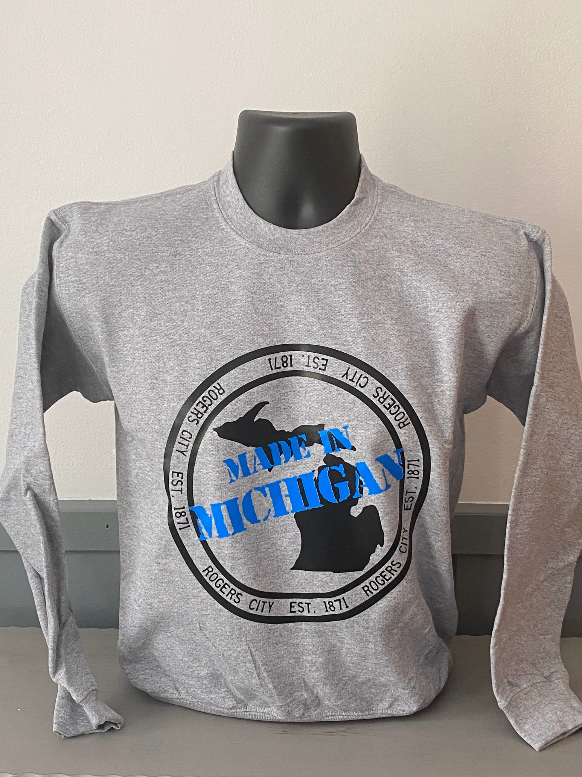 Grey cotton blend crewneck sweatshirt with our Made In Michigan design in black and blue vinyl.