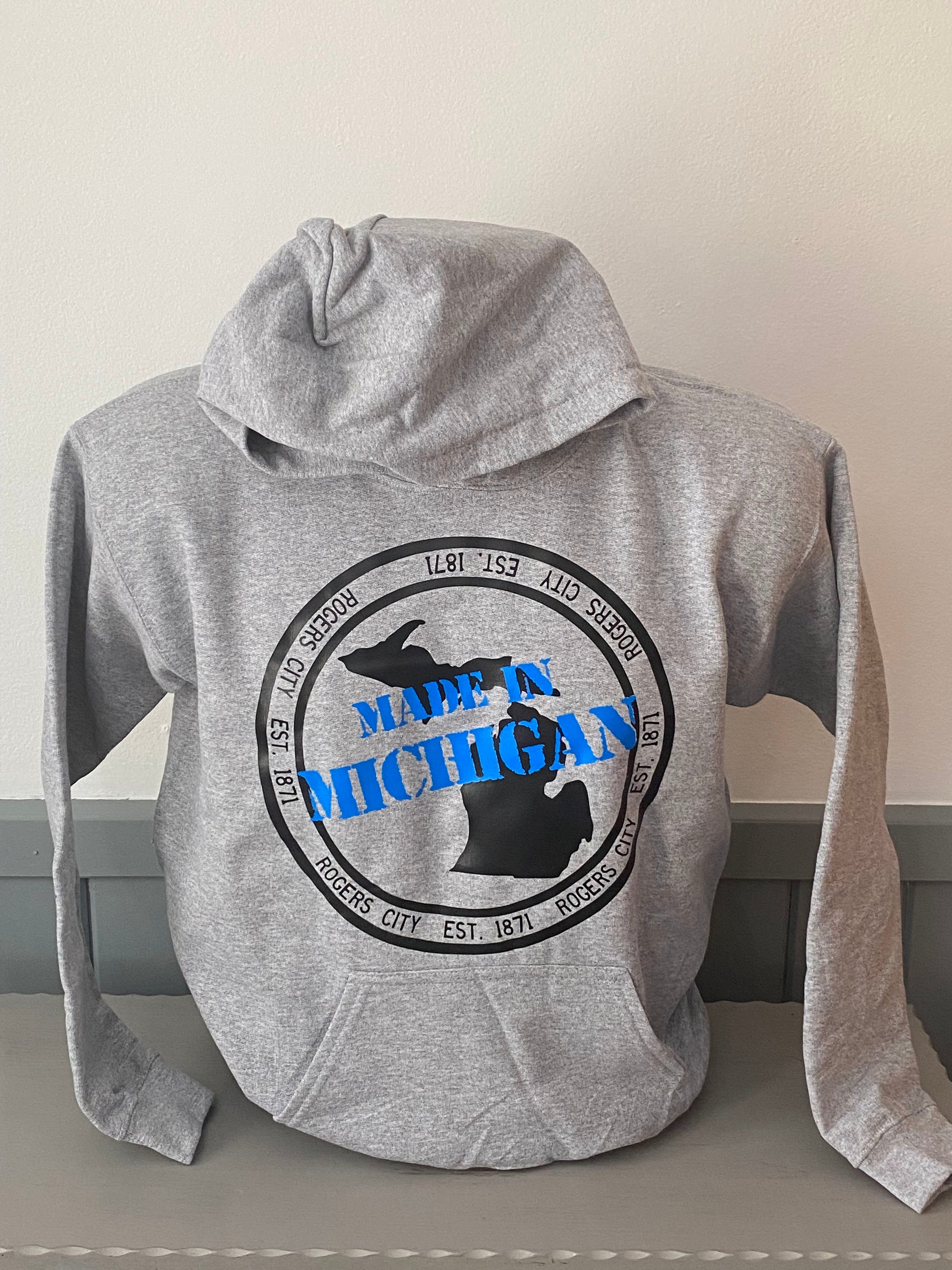 Gildan Brand Grey cotton blend hoodie with our popular Made In Michigan design in black and blue vinyl.