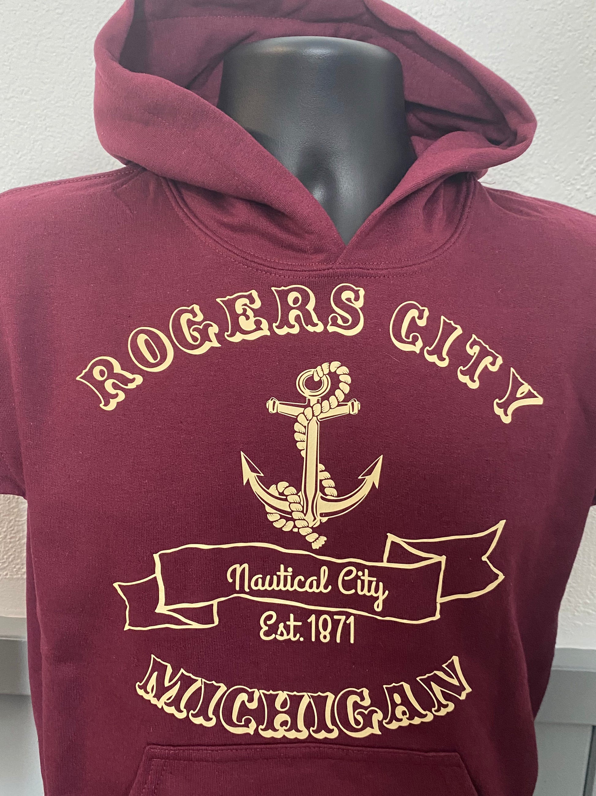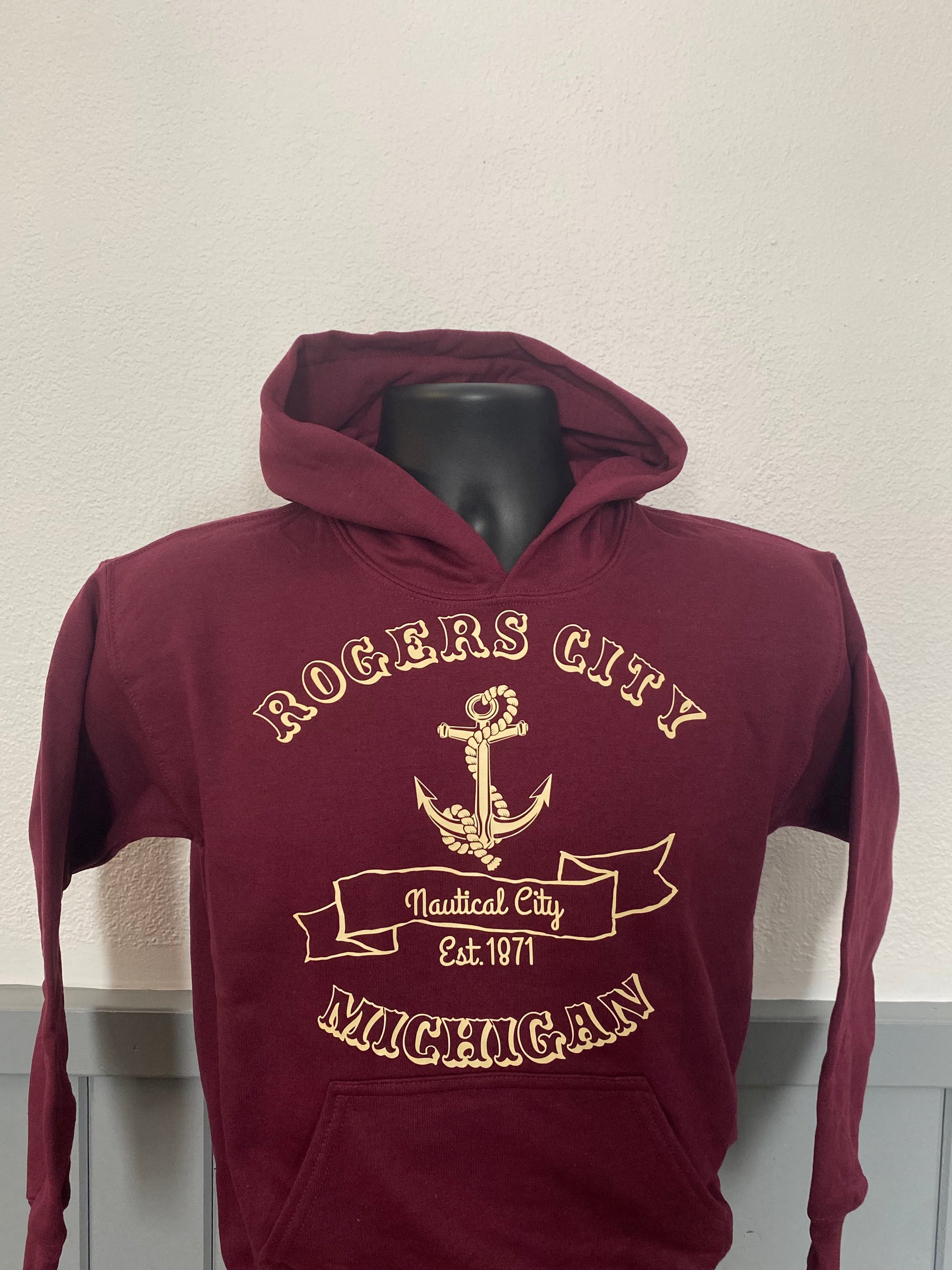 Gildan Brand Maroon cotton blend hoodie with our popular Rogers City Nautical design in cream vinyl.