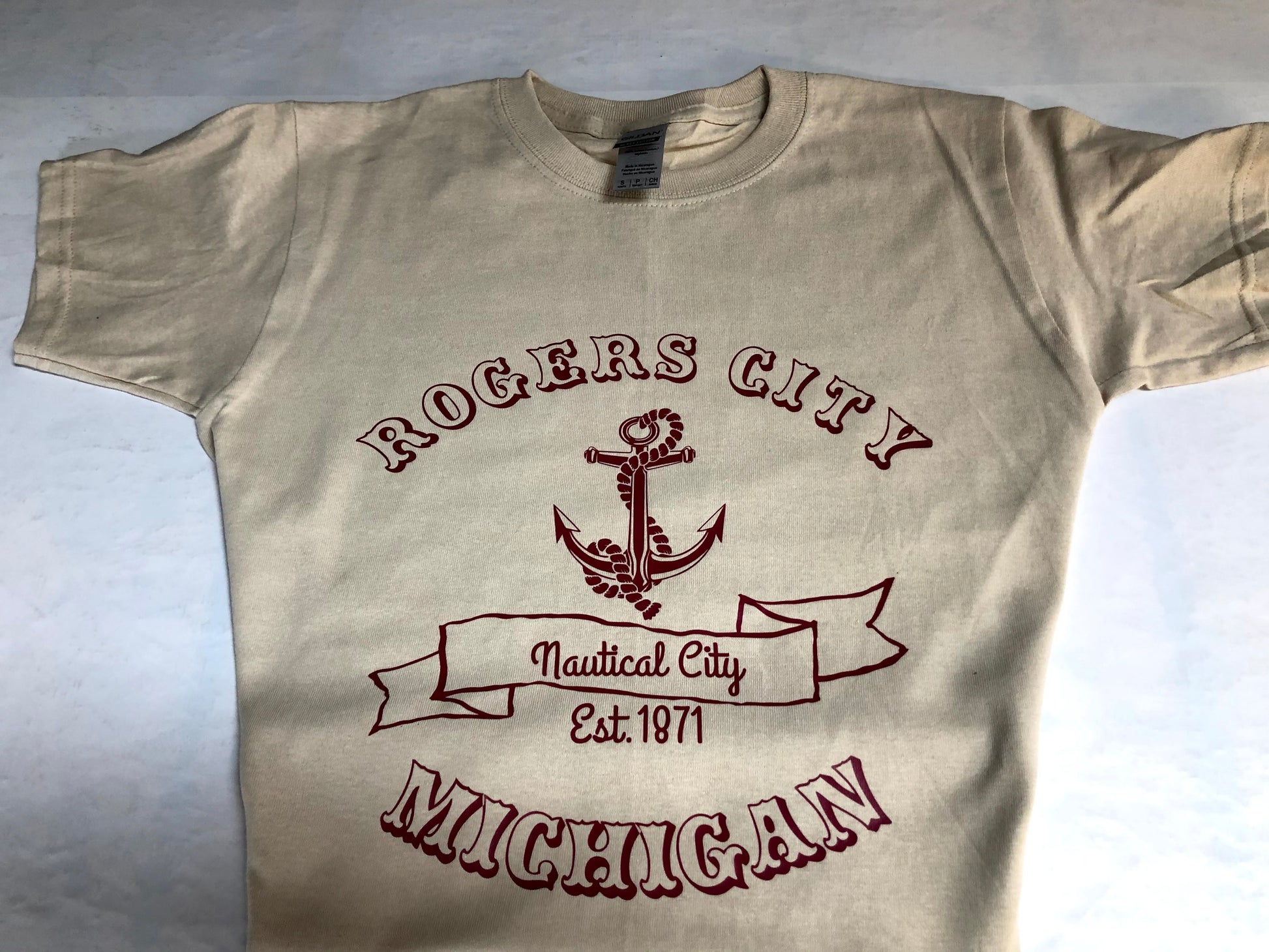 Gildan Brand Tan cotton blend t-shirt with burgundy vinyl design