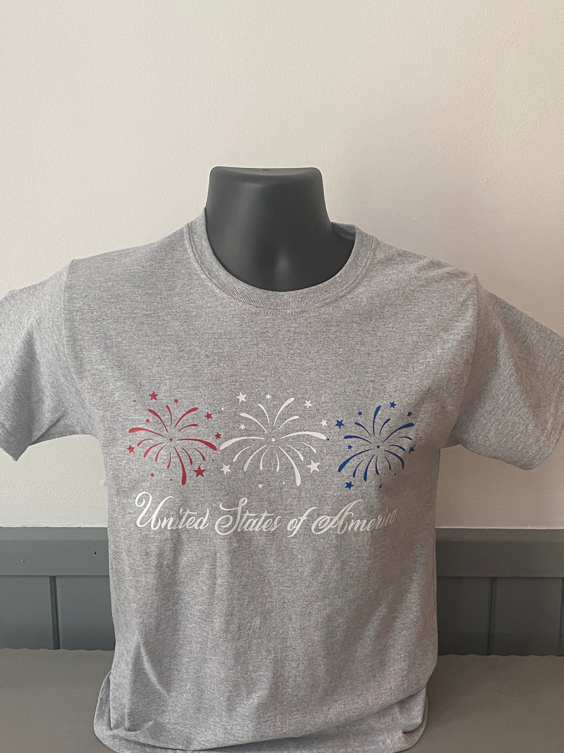 Gildan Brand Grey cotton blend t-shirt featuring a United States of America design in red, white and blue vinyl.